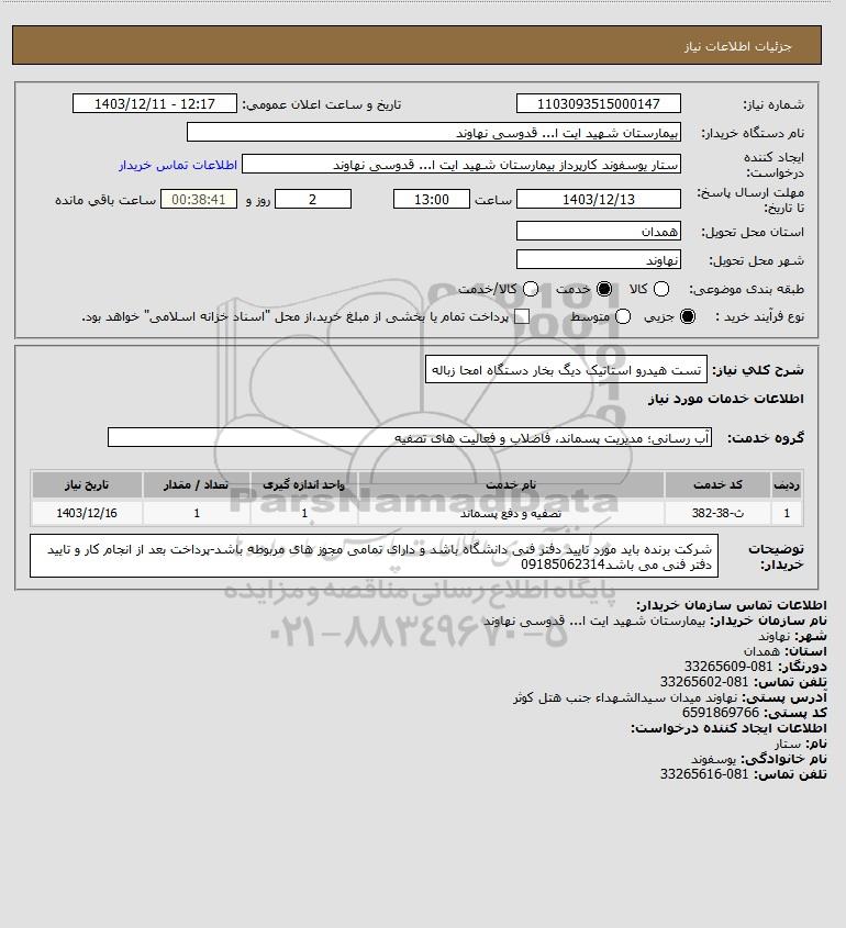 شرح کلی نیاز: تست هیدرو استاتیک دیگ بخار دستگاه امحا زباله