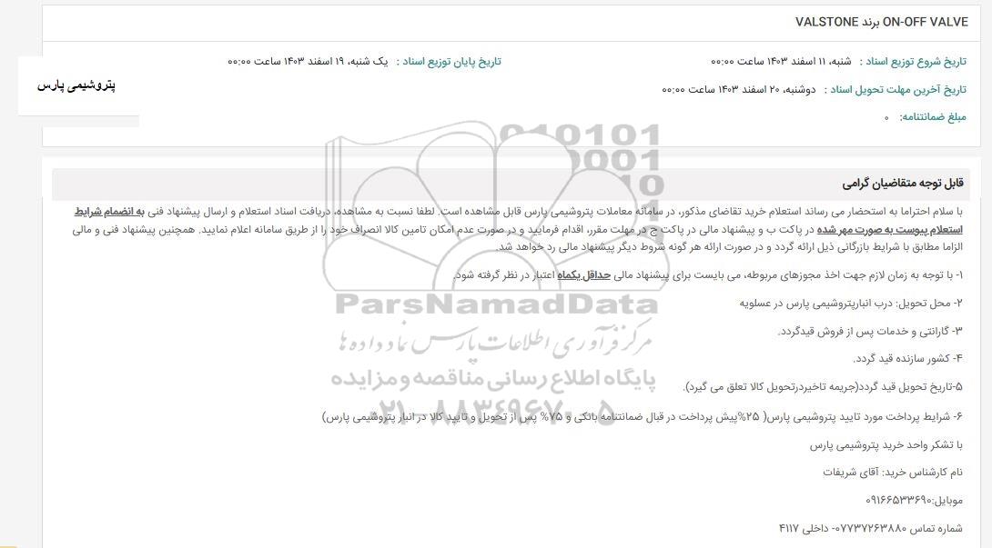 با سلام احتراما به استحضار میرساند استعلام خرید تقاضای مذکور در سامانه معاملات پتروشیمی پارس قابل مشاهده است. لطفا نسبت به مشاهده دریافت اسناد استعلام و ارسال پیشنهاد فنی به انضمام شرایط استعلام پیوست به صورت مهر شده در پاکت به و پیشنهاد مالی در پاکت ج در مهلت مقرر اقدام فرمایید و در صورت عدم امکان تامین کالا انصراف خود را از طریق سامانه اعلام نمایید. همچنین پیشنهاد فنی و مالی الزاما مطابق با شرایط بازرگانی ذیل ارائه گردد و در صورت ارائه هر گونه شروط دیگر پیشنهاد مالی رد خواهد شد.