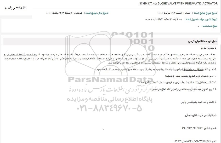 به استحضار میرساند استعلام خرید تقاضای مذکور در سامانه معاملات پتروشیمی پارس قابل مشاهده است. لطفا نسبت به مشاهده دریافت اسناد استعلام و ارسال پیشنهاد فنی به انضمام شرایط استعلام فنی و مالی به پیوست به صورت مهر شده در پاکت ب و پیشنهاد مالی در پاکت ج در مهلت مقرر و عینا مطابق با شرایط استعلام ، اقدام فرمایید و در صورت عدم امکان تامین کالا انصراف خود را از طریق سامانه اعلام نمایید. در صورت ارایه هرگونه پیشنها دفنی و مالی مغایر با شرایط استعلام ، پیشنهادات دریافتی مردود اعلام خواهد شد.