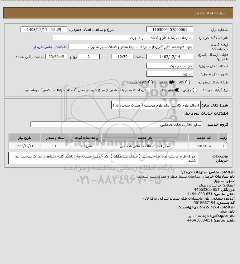 توضیحات خریدار:اجرای طرح کاشت برابر طرح پیوست ( میدان سربداران ). کد خدمت مشابه می باشد کلیه شرایط و مدارک پیوست می باشد