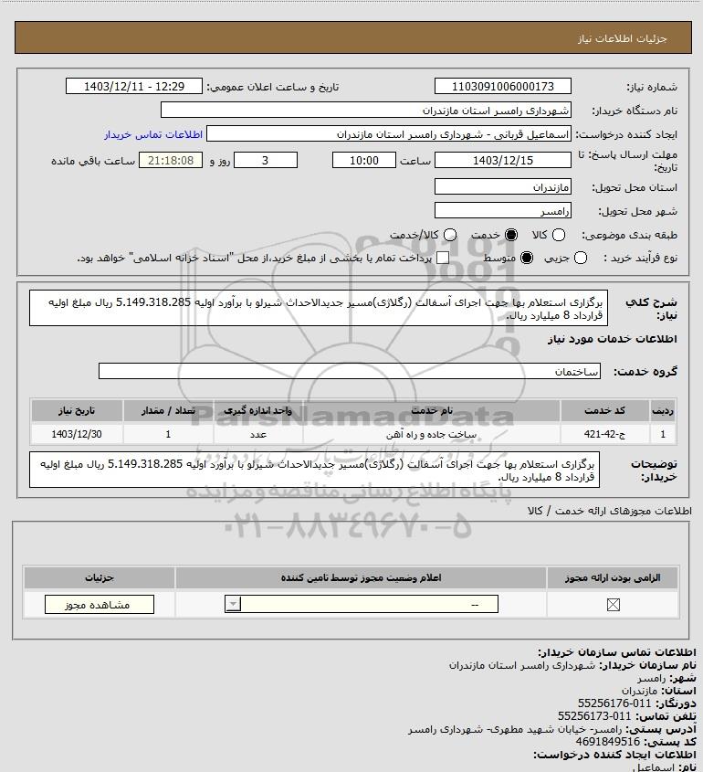توضیحات خریدار:برگزاری استعلام بها جهت اجرای آسفالت (رگلاژی)مسیر جدیدالاحداث شیرلو با برآورد اولیه 5.149.318.285 ریال مبلغ اولیه قرارداد 8 میلیارد ریال.