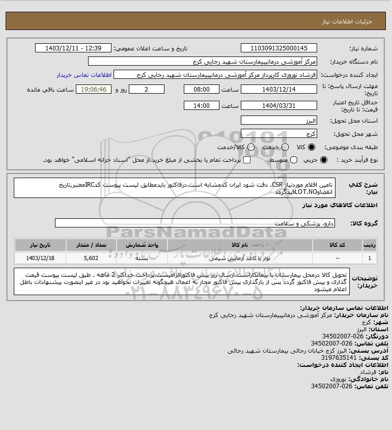 شرح کلی نیاز: تامین اقلام موردنیاز CSR. دقت شود ایران کدمشابه است.درفاکتور بایدمطابق لیست پیوست کدIRCمعتبر,تاریخ انقضاوLOT.NOقیدگردد