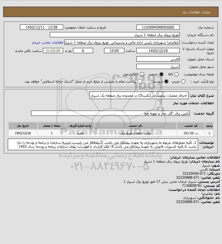شرح کلی نیاز: اجرای عملیات نیرورسانی(تکسا3) در محدوده برق منطقه یک شیراز