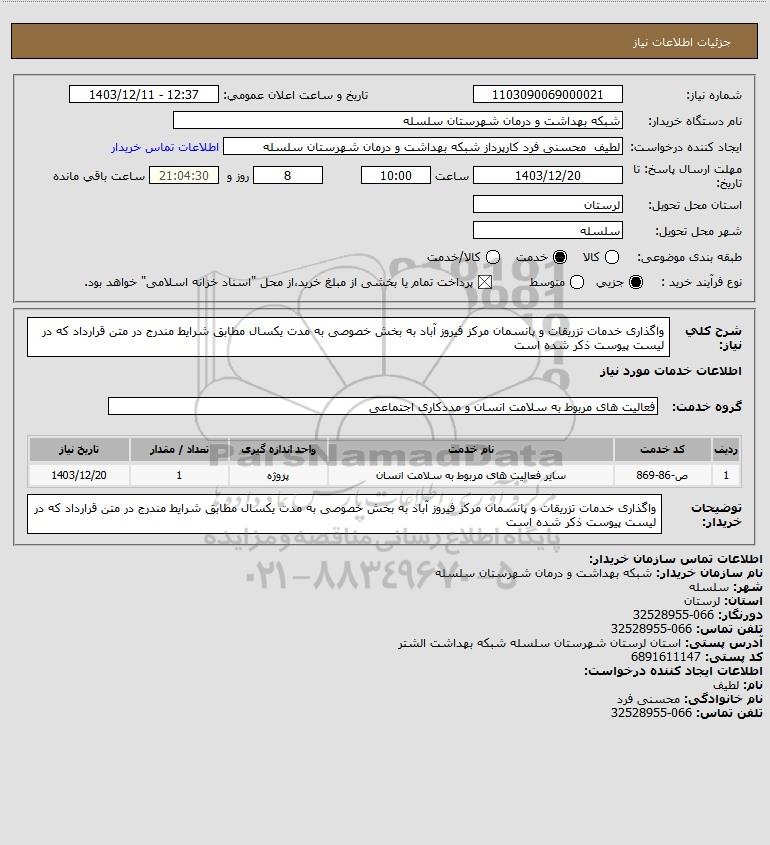 شرح کلی نیاز: واگذاری خدمات تزریقات و پانسمان مرکز فیروز آباد به بخش خصوصی به مدت یکسال مطابق شرایط مندرج در متن قرارداد که در لیست پیوست ذکر شده است