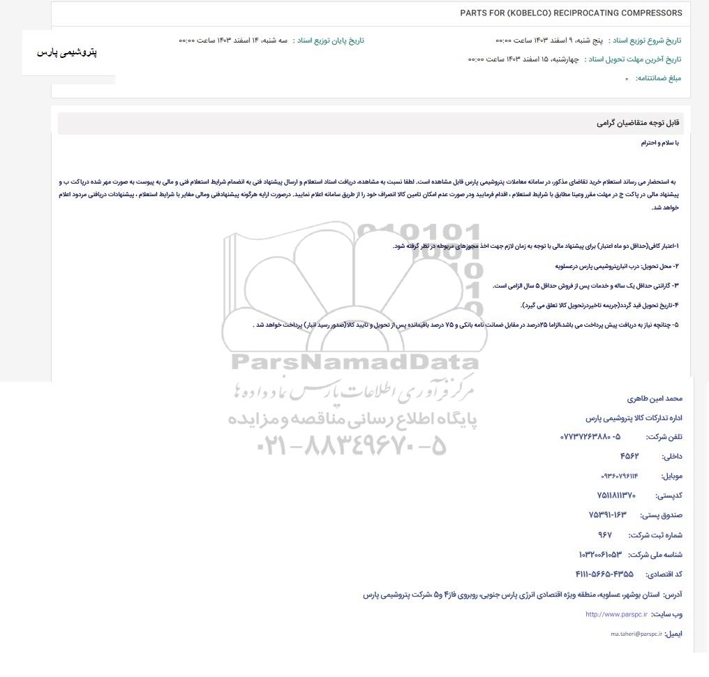 به استحضار میرساند استعلام خرید تقاضای مذکور در سامانه معاملات پتروشیمی پارس قابل مشاهده است. لطفا نسبت به مشاهده دریافت استاد استعلام و ارسال پیشنهاد فنی به انضمام شرایط استعلام فنی و مالی به پیوست به صورت مهر شده در پاکت به و پیشنهاد مالی در پاکت ج در مهلت مقرر و عینا مطابق با شرایط استعلام اقدام فرمایید و در صورت عدم امکان تامین کالا انصراف خود را از طریق سامانه اعلام نمایید. در صورت ارایه هرگونه پیشنها دفنی و مالی مغایر با شرایط استعلام، پیشنهادات دریافتی مردود اعلام