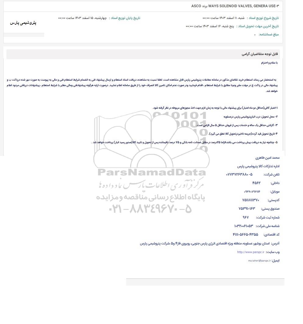 به استحضار میرساند استعلام خرید تقاضای مذکور در سامانه معاملات پتروشیمی پارس قابل مشاهده است. لطفا نسبت به مشاهده دریافت استاد استعلام و ارسال پیشنهاد فنی به انضمام شرایط استعلام فنی و مالی به پیوست به صورت مهر شده دریاکت ب و پیشنهاد مالی در پاکت ج در مهلت مقرر و عینا مطابق با شرایط استعلام اقدام فرمایید و در صورت عدم امکان تامین کالا انصراف خود را از طریق سامانه اعلام نمایید. در صورت ارایه هرگونه پیشنهاد فنی و مالی مغایر با شرایط استعلام، پیشنهادات دریافتی مردود اعلام خواهد شد.