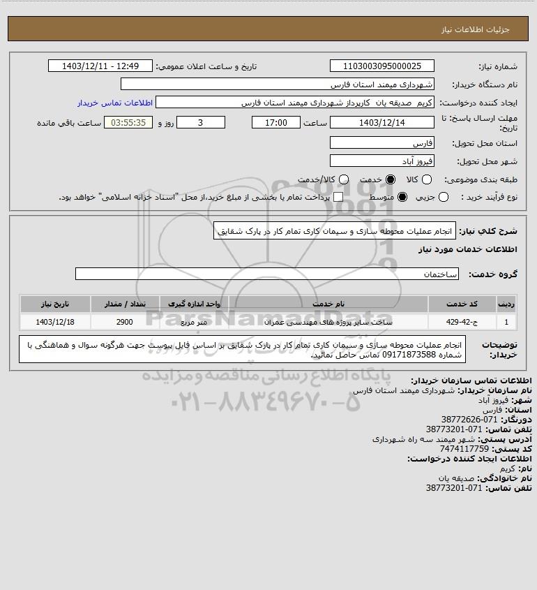 شرح کلی نیاز: انجام عملیات محوطه سازی و سیمان کاری تمام کار در پارک شقایق
