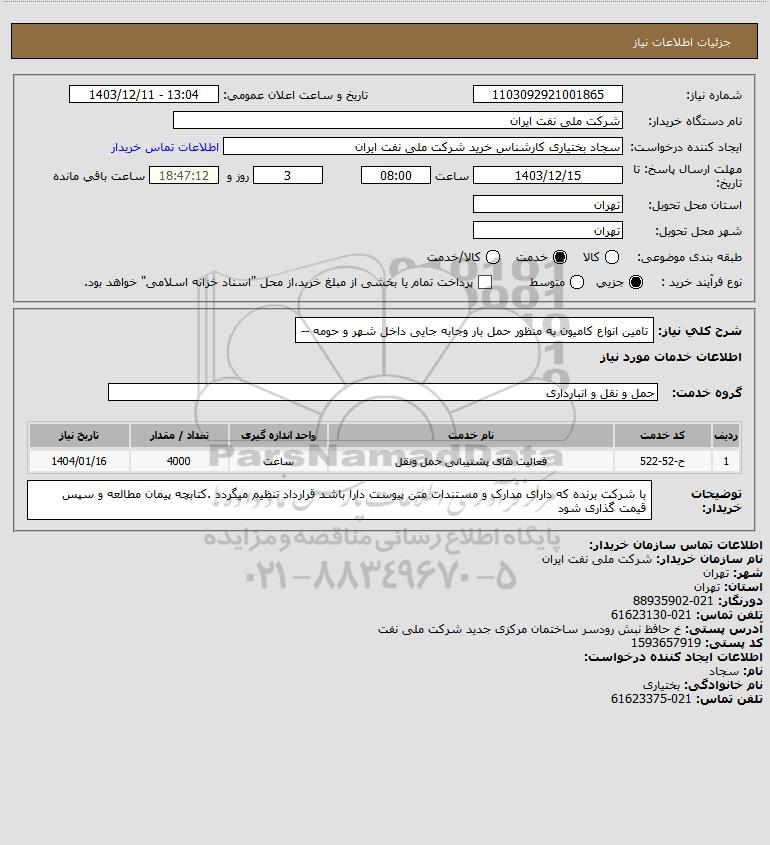 شرح کلی نیاز: تامین انواع کامیون به منظور حمل بار وجابه جایی داخل شهر و حومه --