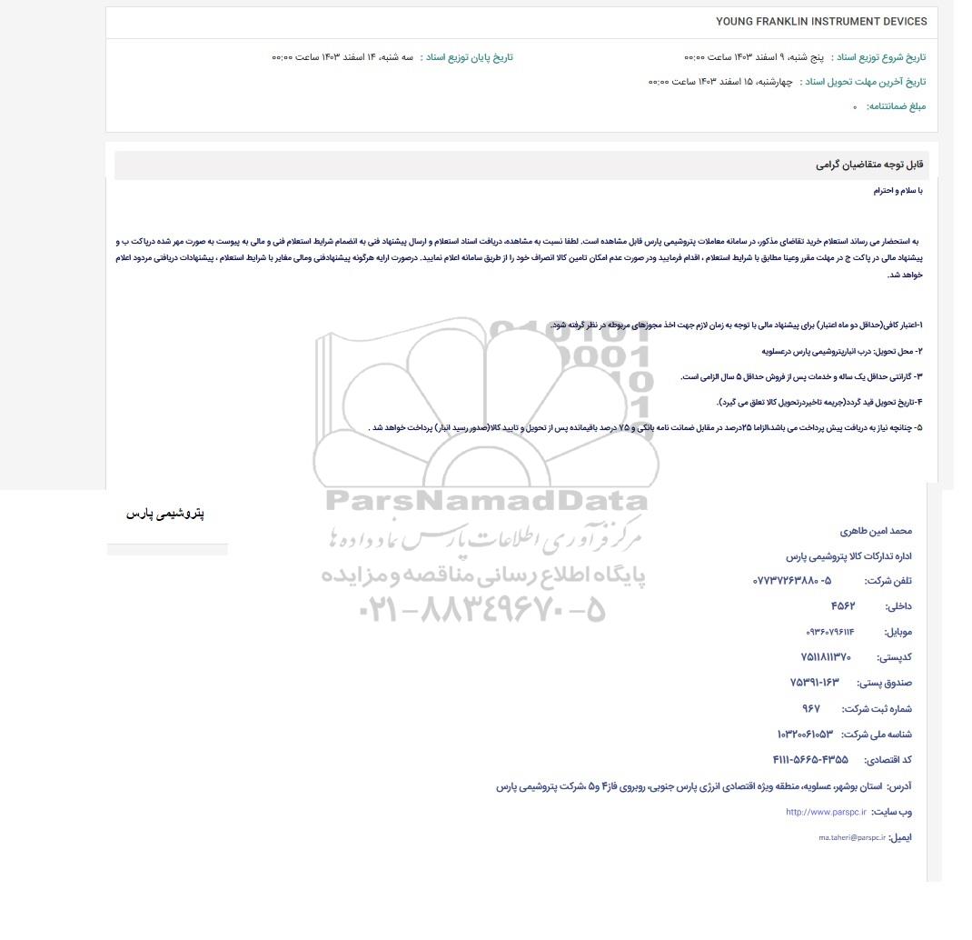 به استحضار میرساند استعلام خرید تقاضای مذکور در سامانه معاملات پتروشیمی پارس قابل مشاهده است. لطفا نسبت به مشاهده دریافت اسناد استعلام و ارسال پیشنهاد فنی به انضمام شرایط استعلام فنی و مالی به پیوست به صورت مهر شده در پاکت ب و پیشنهاد مالی در پاکت ج در مهلت مقرر و عینا مطابق با شرایط استعلام ، اقدام فرمایید و در صورت عدم امکان تامین کالا انصراف خود را از طریق سامانه اعلام نمایید. در صورت ارایه هرگونه پیشنها دفنی و مالی مغایر با شرایط استعلام ، پیشنهادات دریافتی مردود اعلام خواهد شد.