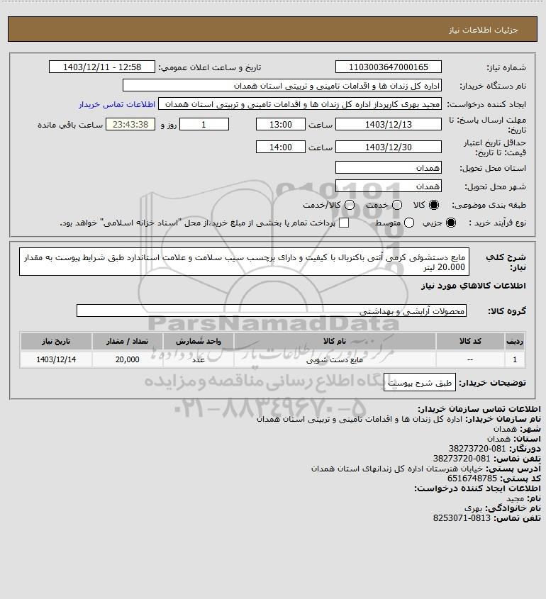 | 1 | -- | مایع دست شویی | عدد | 20,000 | 1403/12/14 |