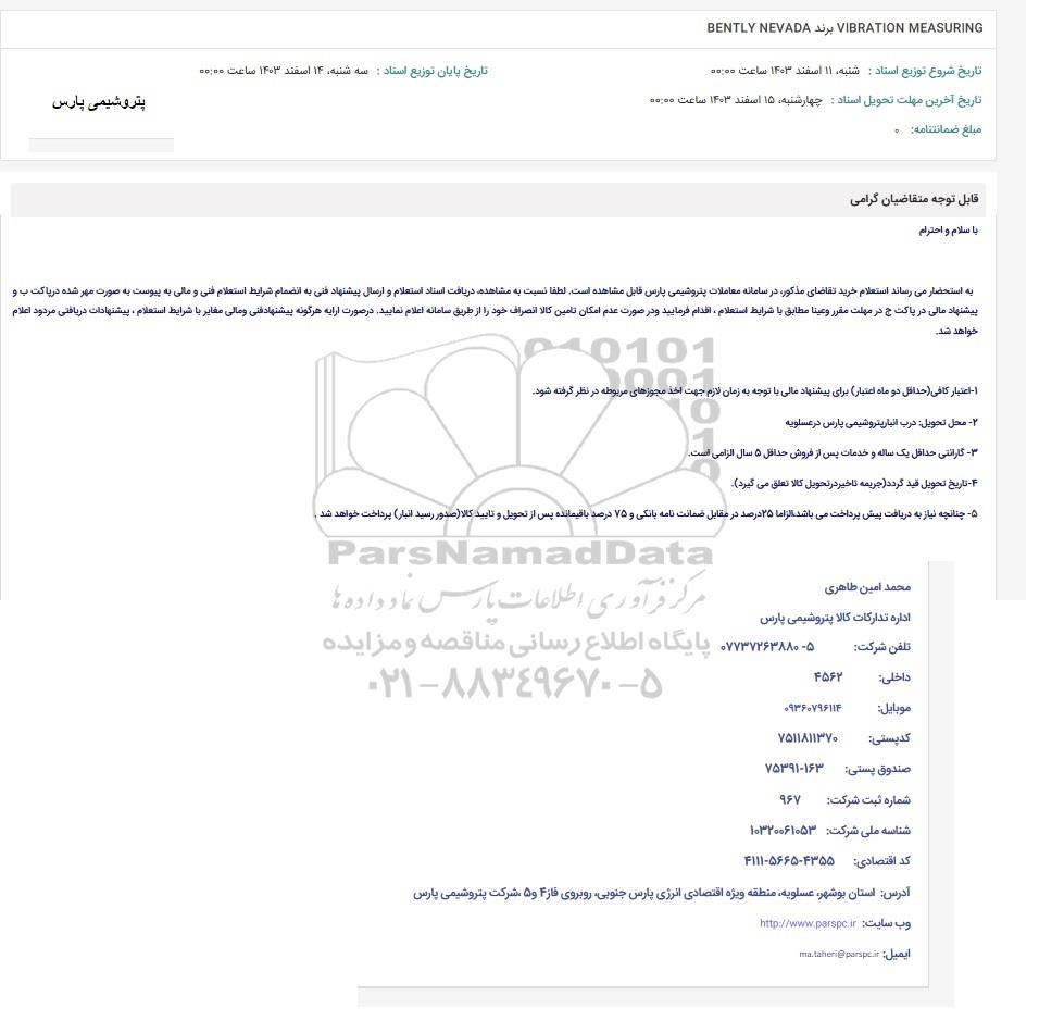 به استحضار میرساند استعلام خرید تقاضای مذکور در سامانه معاملات پتروشیمی پارس قابل مشاهده است. لطفا نسبت به مشاهده دریافت اسناد استعلام و ارسال پیشنهاد فنی به انضمام شرایط استعلام فنی و مالی به پیوست به صورت مهر شده در پاکت ب و پیشنهاد مالی در پاکت ج در مهلت مقرر وعينا مطابق با شرایط استعلام ، اقدام فرمایید و در صورت عدم امکان تامین کالا انصراف خود را از طریق سامانه اعلام نمایید. در صورت ارایه هرگونه پیشنها دفنی و مالی مغایر با شرایط استعلام ، پیشنهادات دریافتی مردود اعلام خواهد شد.