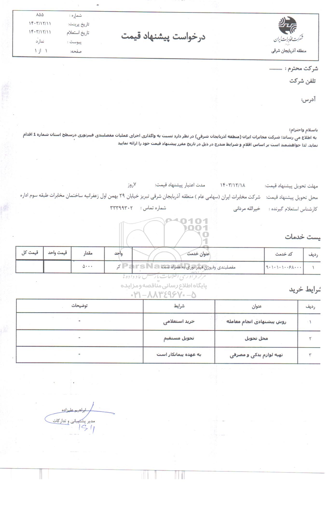 محل تحویل پیشنهاد قیمت: شرکت مخابرات ایران (سهامی عام) منطقه آذربایجان شرقی، تبریز ،خیابان 29 بهمن، اول زعفرانیه، ساختمان مخابرات، طبقه سوم اداره