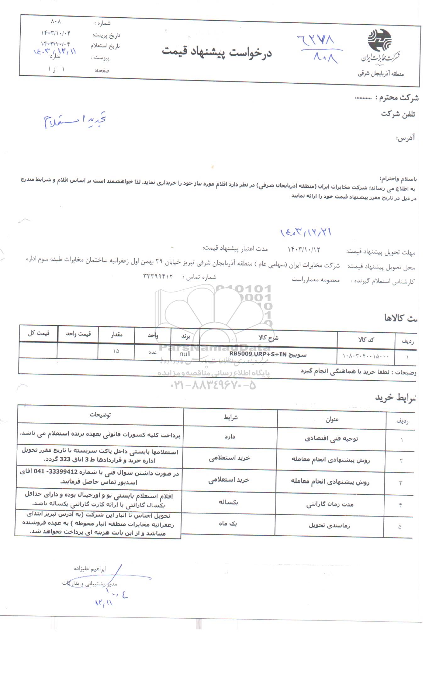 احتراما به اطلاع می رساند شرکت مخابرات ایران (منطقه آذربایجان شرقی) در نظر دارد اقلام مورد نیاز خود را خریداری نماید. لذا خواهشمند است براساس اقلا و شرایط مندرج در ذیل در تاریخ مقرر پیشنهاد قیمت خود را ارایه نمایید.