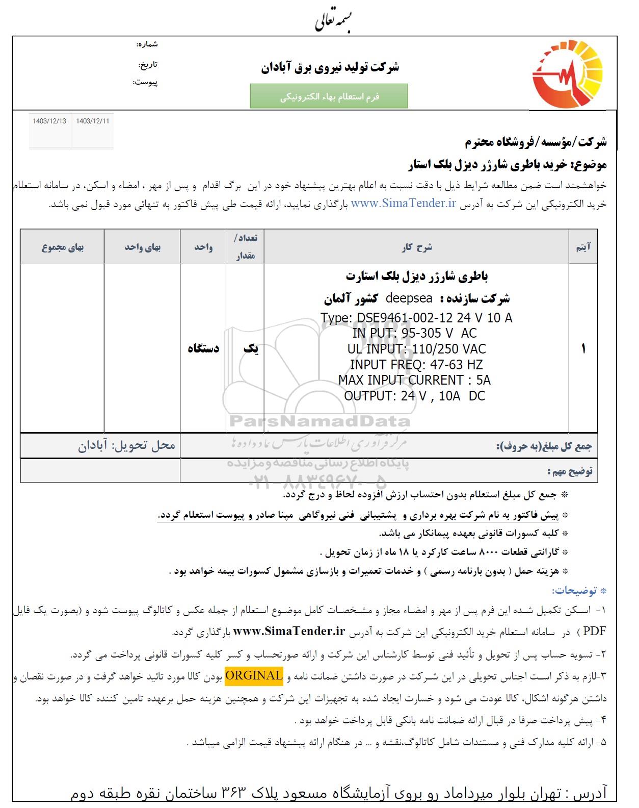 خواهشمند است ضمن مطالعه شرایط ذیل با دقت نسبت به اعلام بهترین پیشنهاد خود در این برگ اقدام و پس از مهر، امضاء و اسکن در سامانه استعلام خرید الکترونیکی این شرکت به آدرس www.SimaTender.ir بارگذاری نمایید ارائه قیمت طی پیش فاکتور به تنهایی مورد قبول نمی باشد.