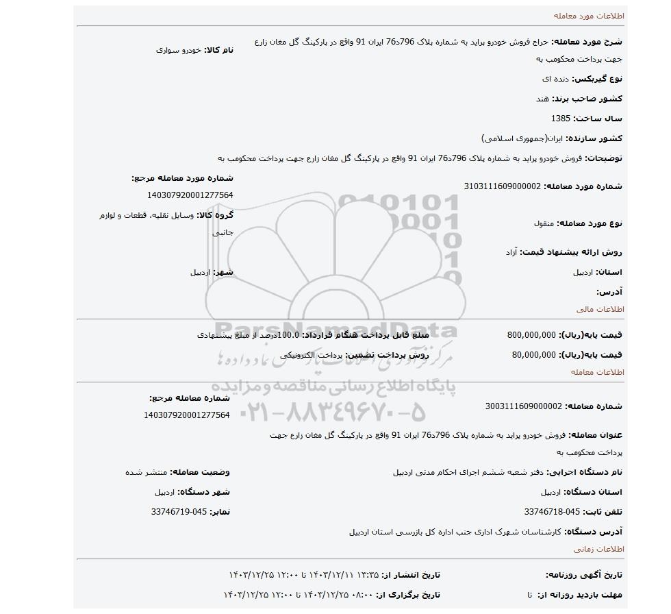 عنوان معامله: فروش خودرو پراید به شماره پلاک 796د76 ایران 91 واقع در پارکینگ گل مغان زارع جهت پرداخت محکومب به | ||
