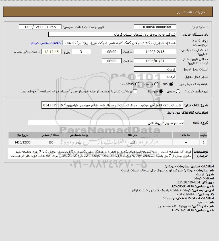 نام دستگاه خریدار:شرکت توزیع نیروی برق شمال استان کرمان
