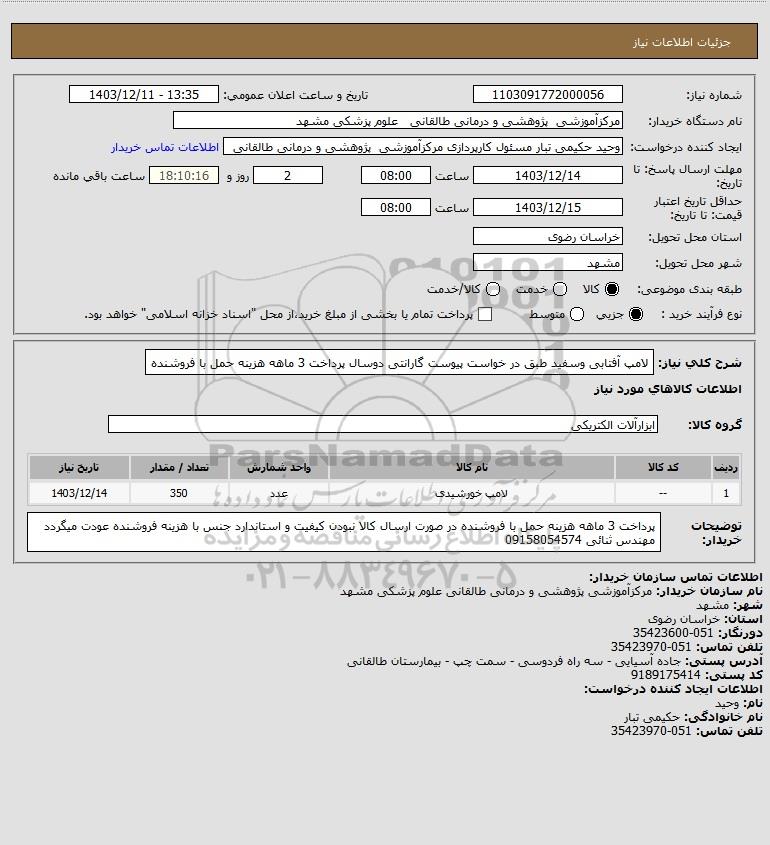 شرح کلی نیاز: لامپ آفتابی وسفید طبق در خواست پیوست گارانتی دوسال پرداخت 3 ماهه هزینه حمل با فروشنده