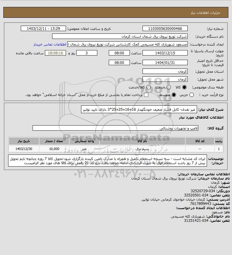 شرح کلی نیاز: غیر نقدی- کابل فشار ضعیف خودنگهدار 16+16+25+25*3 دارای تایید توانیر