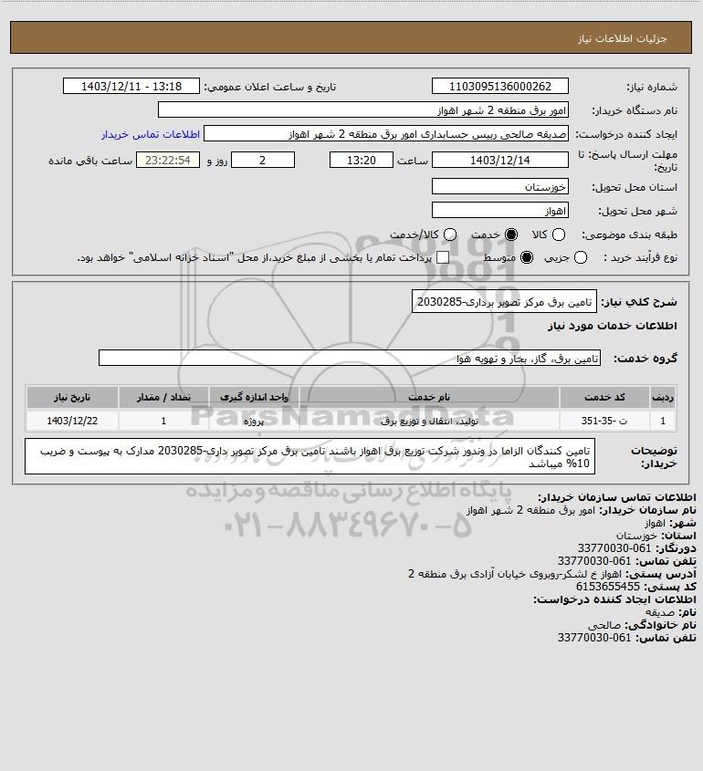 توضیحات خریدار:تامین کنندگان الزاما در وندور شرکت توزیع برق اهواز باشند
