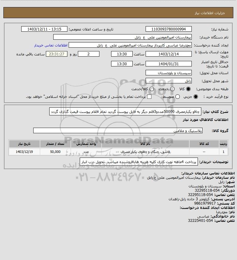 شرح کلی نیاز: چاقو یکبارمصرف 50000عددو3قلم دیگر به فایل پیوست گردید تمام اقلام پیوست قیمت گذاری گردد
