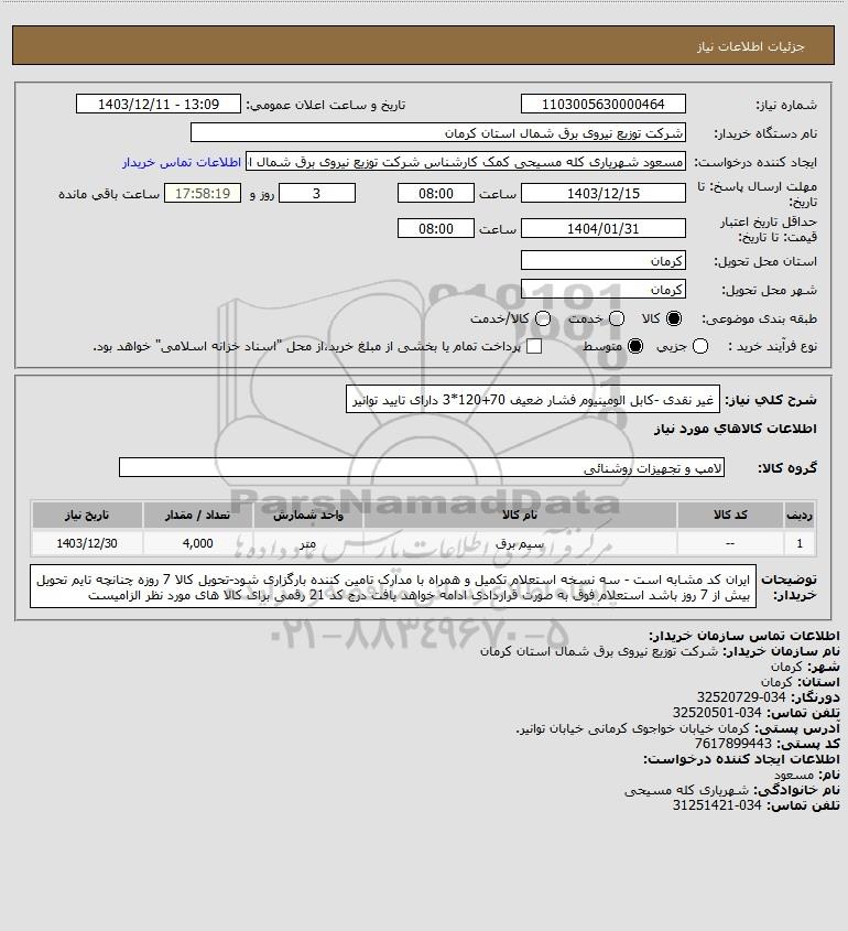 شرح کلی نیاز: غیر نقدی -کابل الومینیوم فشار ضعیف 70+120*3 دارای تایید توانیر