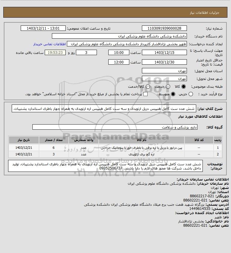 شرح کلی نیاز: شش عدد ست کامل هنپیس دریل ارتوپدی و سه ست کامل هنپیس اره ارتوپدی به همراه چهار باطری استاندارد پشتیبان.