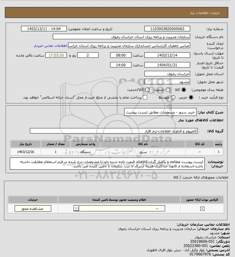 شرح کلی نیاز: خرید سرور - مشخصات مطابق لیست پیوست