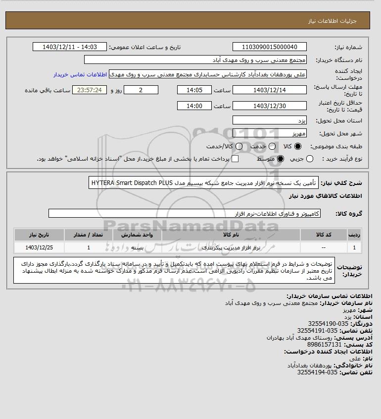 نام دستگاه خریدار:مجتمع معدنی سرب و روی مهدی آباد