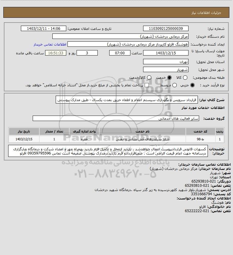 شرح کلی نیاز: قرارداد سرویس و نگهداری سیستم اعلام و اطفاء حریق بمدت یکسال - طبق مدارک پیوستی