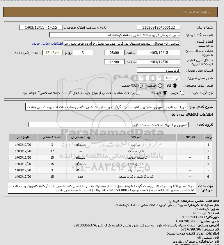 شرح کلی نیاز: تهیه لپ تاپ , کامپیوتر, مانیتور , هارد , کارت گرافیک و ... لیست شرح اقلام و مشخصات آن پیوست می باشد.