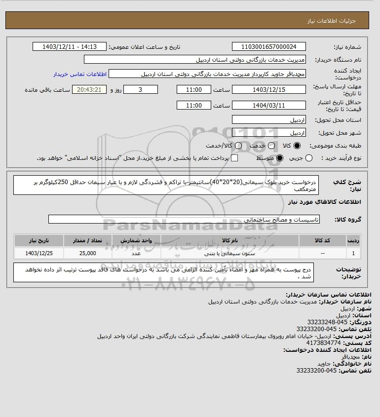 شرح کلی نیاز: درخواست خرید بلوک سیمانی(20*20*40)سانتیمتر-با تراکم و فشردگی لازم و با عیار سیمان حداقل 250کیلوگرم بر مترمکعب