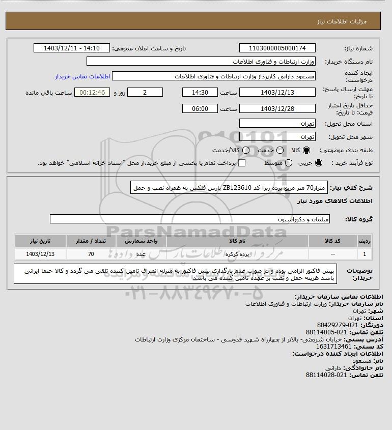 شرح کلی نیاز: متراژ70 متر مربع پرده زبرا کد ZB123610 پارس فلکس به همراه نصب و حمل