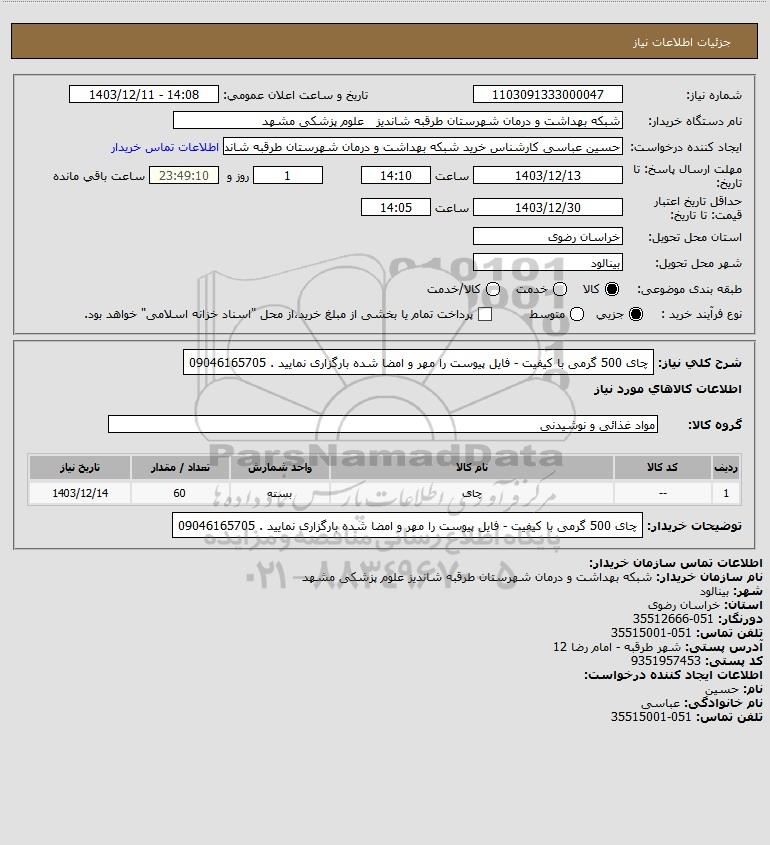شرح کلی نیاز: چای 500 گرمی با کیفیت - فایل پیوست را مهر و امضا شده بارگزاری نمایید . 09046165705