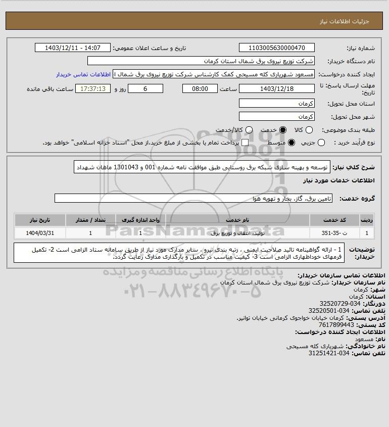 استعلام توسعه و بهینه سازی شبکه برق روستایی طبق موافقت نامه شماره 001 و 1301043 ماهان شهداد, استعلام توسعه و بهینه سازی شبکه برق روستایی طبق موافقت نامه شماره 001 و 1301043 ماهان شهداد