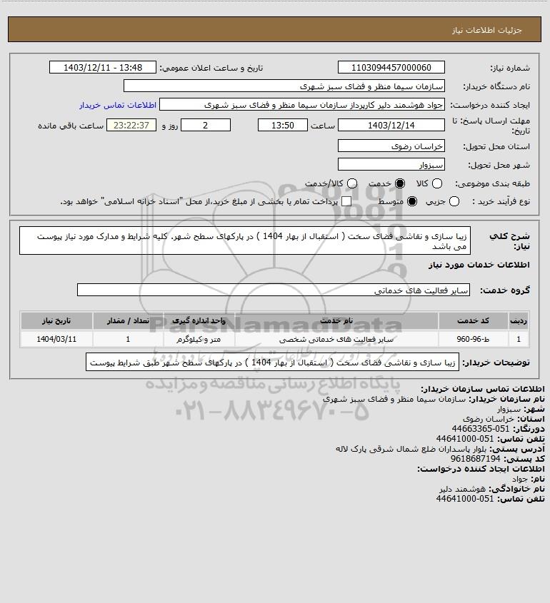 شرح کلی نیاز: زیبا سازی و نقاشی فضای سخت ( استقبال از بهار 1404 ) در پارکهای سطح شهر. کلیه شرایط و مدارک مورد نیاز پیوست می باشد