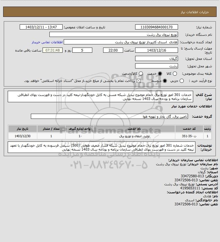 استعلام خدمات 301 امور توزیع برق خمام موضوع تبدیل شبکه مسی به کابل خودنگهدار-نیمه کلید در دست و فهرست بهای انطباقی سازمان برنامه و بودجه سال 1403 نسخه نهایی, استعلام خدمات 301 امور توزیع برق خمام موضوع تبدیل شبکه مسی به کابل خودنگهدار-نیمه کلید در دست و فهرست بهای انطباقی سازمان برنامه و بودجه سال 1403 نسخه نهایی