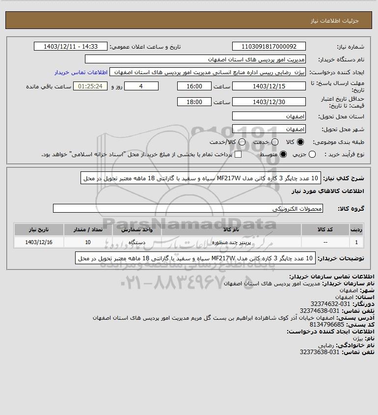 شرح کلی نیاز: 10 عدد چاپگر 3 کاره کانن مدل MF217W سیاه و سفید با گارانتی 18 ماهه معتبر تحویل در محل