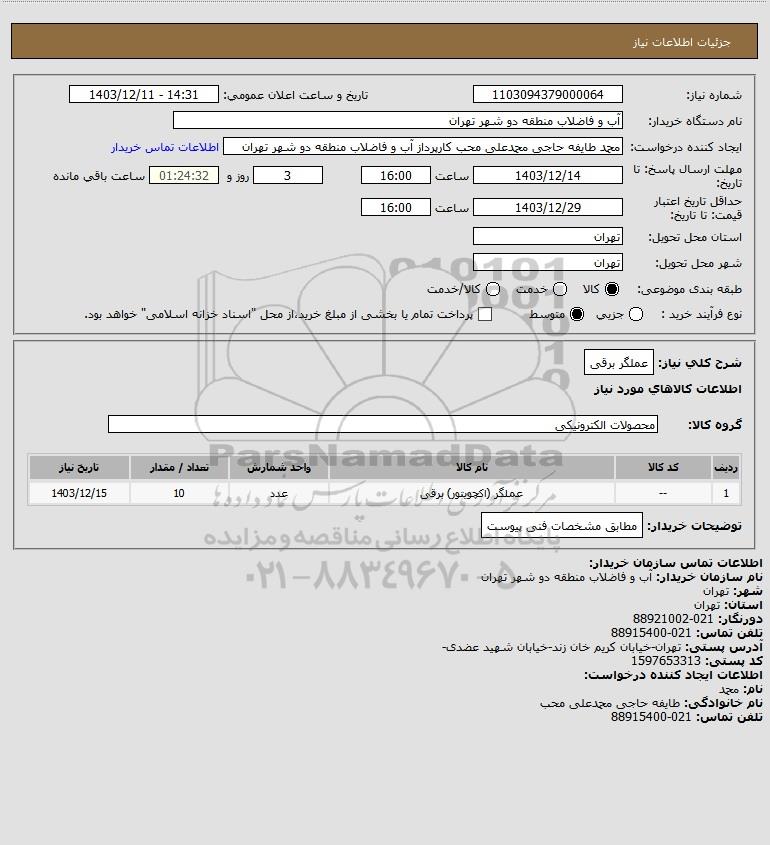 استعلام بها و موضوع استعلام استعلام عملگر برقی به اطلاع کلیه شرکتها و افراد متخصص واجد شرایط میرساند، آگهی گذار در نظر دارد از طریق استعلام بها، نسبت به انتخاب و دریافت پیشنهادات اقدام نماید. این استعلام با کد آگهی ثبت شده در سامانه خبرگزاری پارس نماد : 8745202 منتشر شده است. مشخصات استعلام : تاریخ شروع استعلام: 1403/12/11 آخرین مهلت ارسال پیشنهاد قیمت : 1403/12/14 و محل اجرای پروژه : استان تهران میباشد. استعلام قیمت مورد درخواست : استعلام عملگر برقی با دستهبندیهای تخصصی و گروه های مرتبط : ابزار دقیق, شیرآلات, تجهیزات برق و الکترونیک, استعلام اطلاع رسانی میگردد.