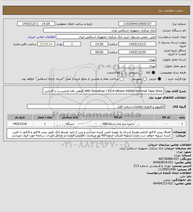 شرح کلی نیاز: HPE StoreEver LTO‑9 Ultrium 45000 External Tape Drive گواهی افتا الزامیست با گارانتی