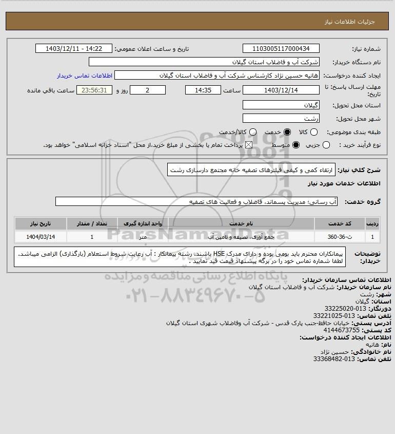 شرح کلی نیاز: ارتقاء کمی و کیفی فیلترهای تصفیه خانه مجتمع دارسازی رشت