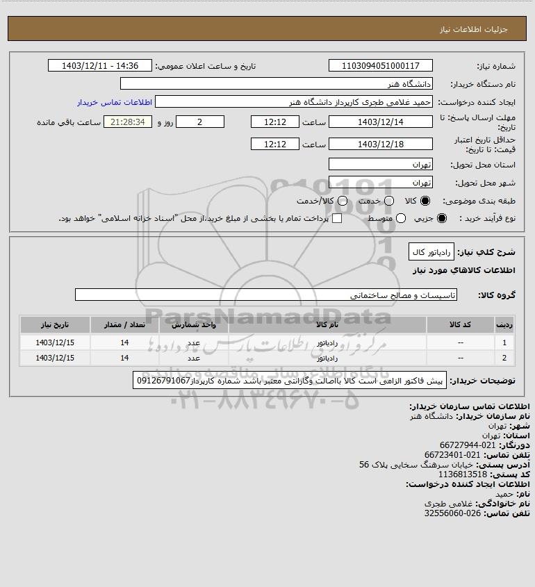 شرح کلی نیاز: رادیاتور کال