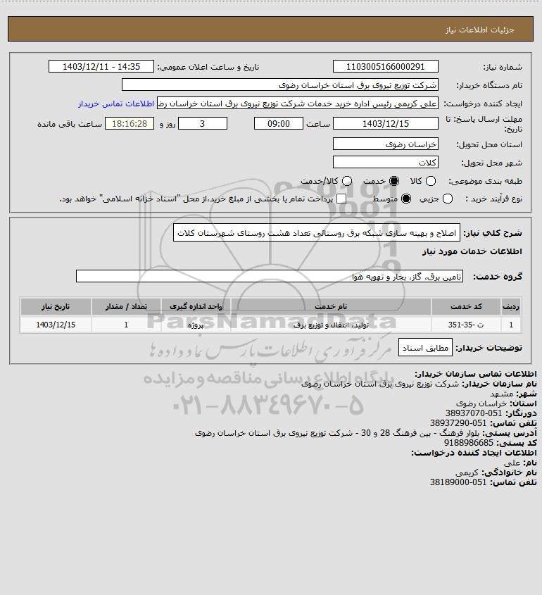 استعلام اصلاح و بهینه سازی شبکه برق روستائی تعداد هشت روستای شهرستان کلات, استعلام اصلاح و بهینه سازی شبکه برق روستائی تعداد هشت روستای شهرستان کلات
