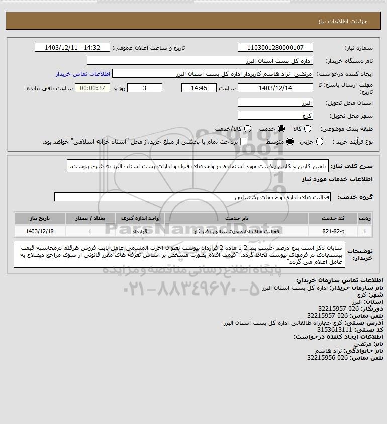 شرح کلی نیاز: تامین کارتن و کارتن پلاست مورد استفاده در واحدهای قبول و ادارات پست استان البرز به شرح پیوست.