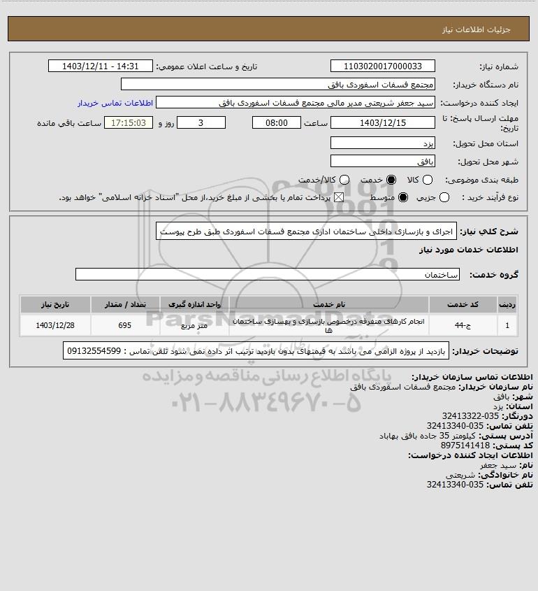 شرح کلی نیاز: اجرای و بازسازی داخلی ساختمان اداری مجتمع فسفات اسفوردی طبق طرح پیوست