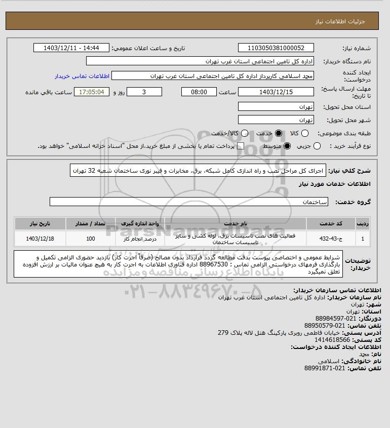 شرح کلی نیاز: اجرای کل مراحل نصب و راه اندازی کامل شبکه، برق، مخابرات و فیبر نوری ساختمان شعبه 32 تهران