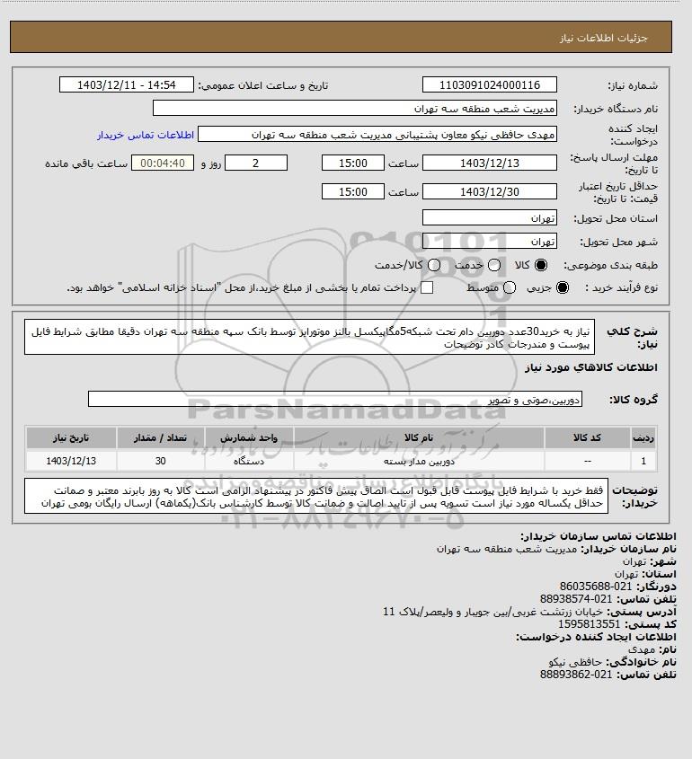 شرح کلی نیاز: نیاز به خرید30عدد دوربین دام تحت شبکه5مگاپیکسل بالنز موتورایز توسط بانک سپه منطقه سه تهران دقیقا مطابق شرایط فایل پیوست و مندرجات کادر توضیحات