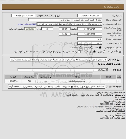 نام دستگاه خریدار:اداره کل کمیته امداد امام خمینی ره استان فارس