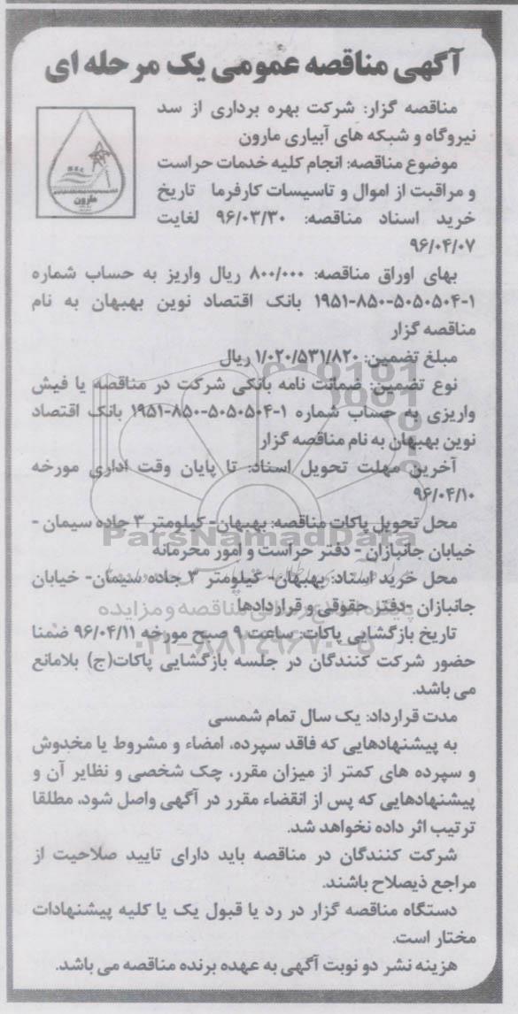 مناقصه گزار : شرکت بهره برداری از سد ، نیروگاه و شبکه های آبیاری مارون