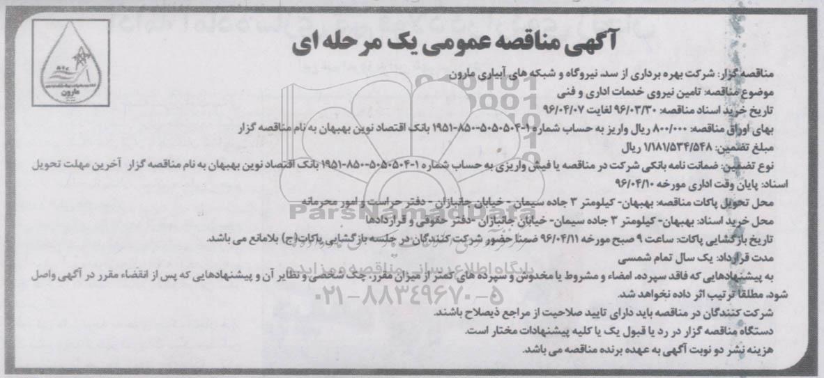 موضوع مناقصه : تامین نیروی خدمات اداری و فنی