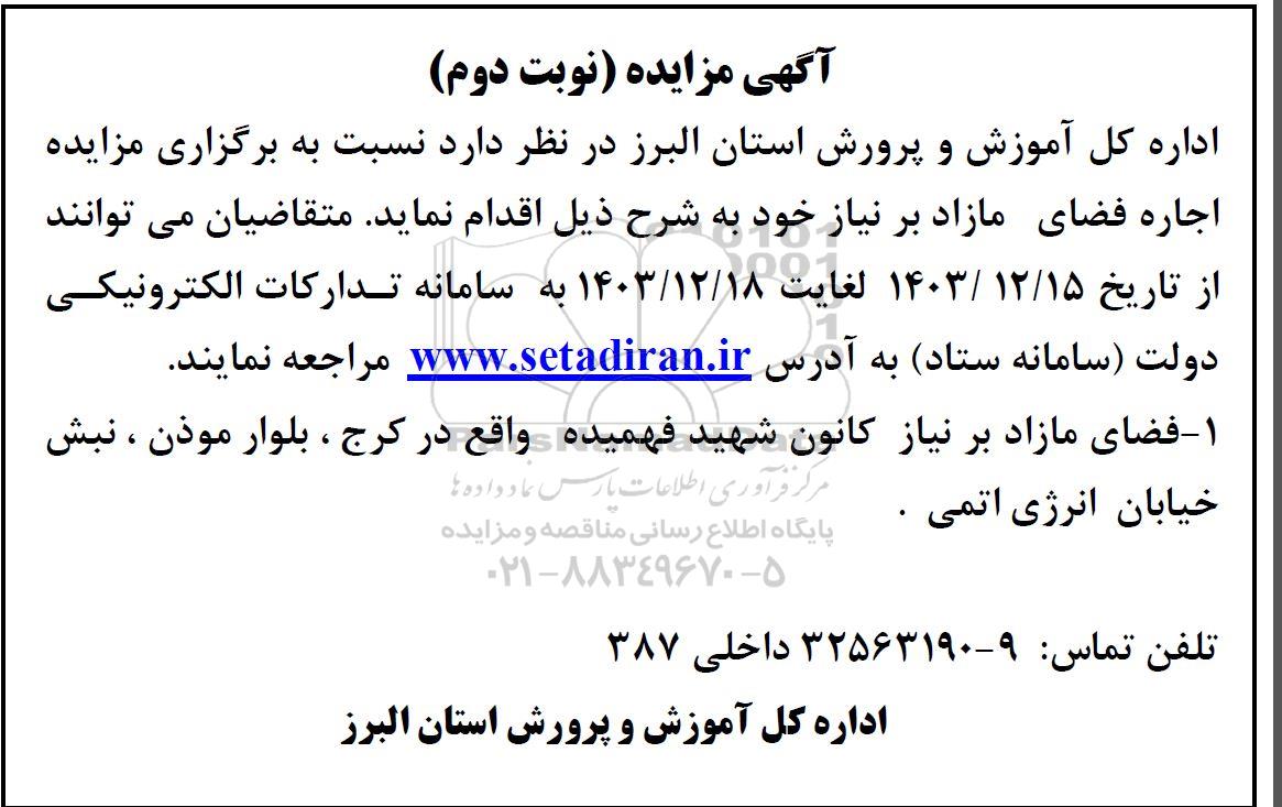 اداره کل آموزش و پرورش استان البرز در نظر دارد نسبت به برگزاری مزایده اجاره فضای مازاد بر نیاز خود به شرح ذیل اقدام نماید متقاضیان می توانند از تاریخ 1403.12.15 لغایت 1403.12.18 به سامانه تدارکات الکترونیکی دولت سامانه ستاد به آدرس ستاد ایران مراجعه نمایند.